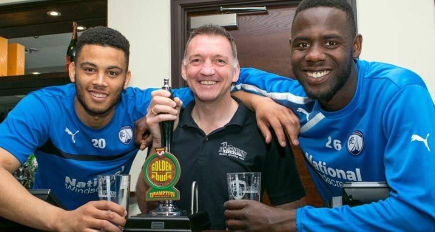 (Photo shows Brampton Brewery managing director Chris Radford (centre) with Chesterfield players Aaron Chapman & Mani Dieseruvwe. Courtesy of Tina Jenner.)