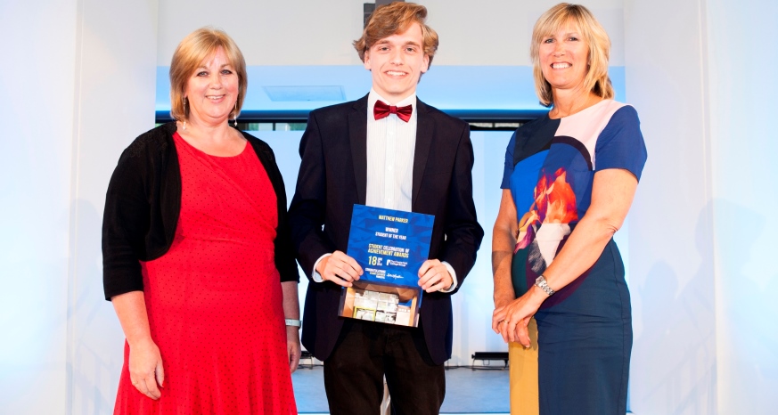 Photograph below shows: Student of the Year, Matthew Parker (centre) with Gill Parkes, Assistant Principal at Chesterfield College (left) and Professor Liz Barnes, Deputy Vice Chancellor for Sheffield Hallam University.