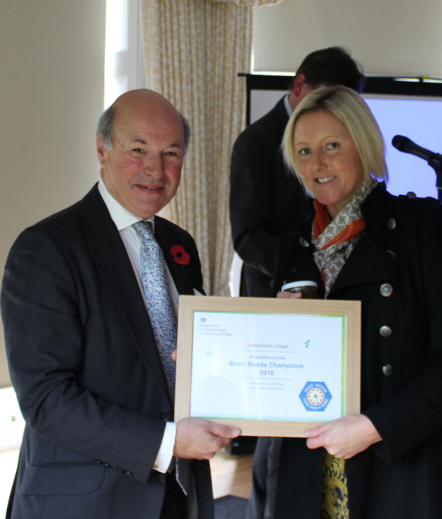 Defra Minister Lord Gardiner presented Chesterfield College with a Bees Needs award for one of the best youth projects in the UK designed to create bee friendly environments yesterday.
