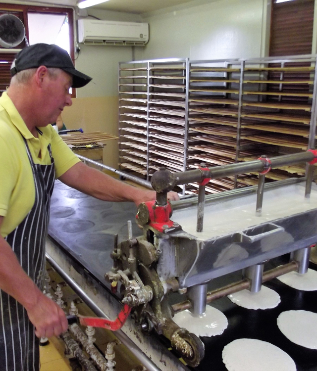 LPG fires up Ian’s gargantuan, vintage, 18-foot hotplate with its gas jets underneath which cooks up to five dozen oatcakes at a time, totalling 200-300 dozen oatcakes or thicker pikelets per shift.