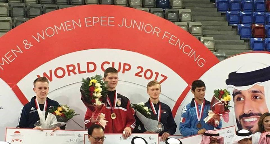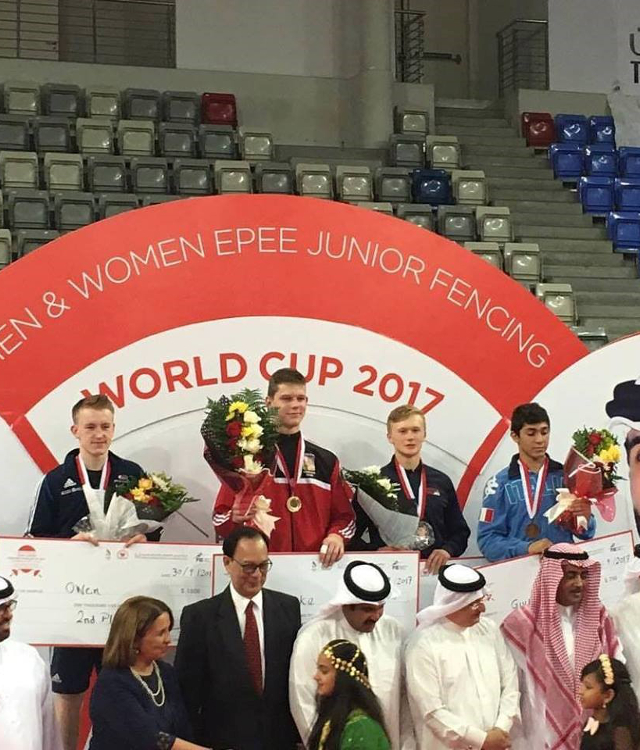 Matt won all of his poule fights at the competition, held in Bahrain, to be seeded number 3 in the competition which gave him an automatic bye into the last 32 where he comfortably won his direct elimination fights taking him through to the semi-final match where he faced world number 2 Jakub Jurka from Slovakia.