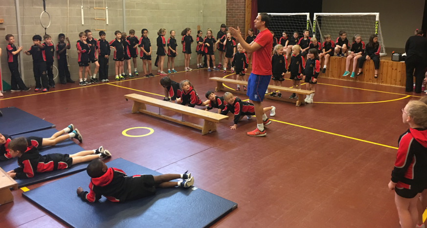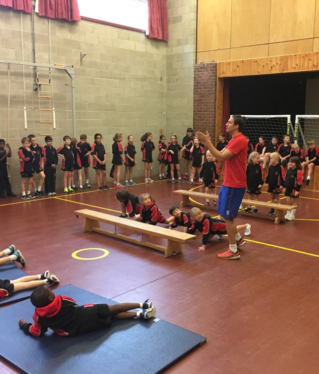 James led an energy fueled fitness circuit for the students at the independent school, who did a magnificent job of spotty dog strides, star jumps, step ups and press ups as part of a sponsored campaign to raise money for Olympic and Paralympic athletes.