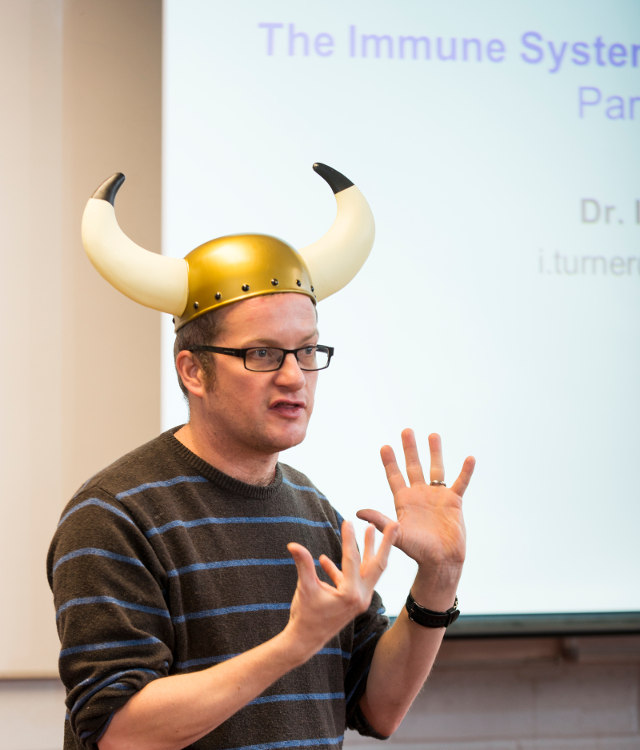 Dr Turner’s unique teaching style uses a creative approach he devised called Lecture Theatre Pantomime. This uses costumes, role play, props and analogies to make demanding subjects such as immunology and genetics both enjoyable and accessible to his students.