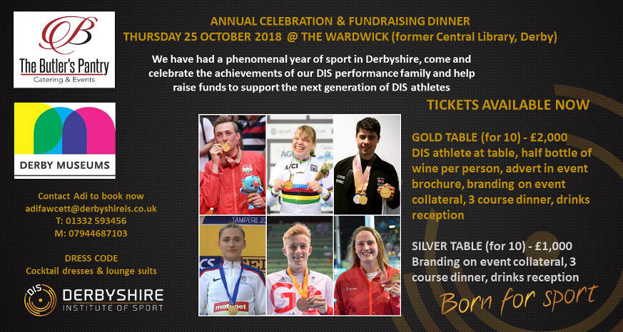 The Annual Celebration and Fundraising Dinner is the main event of the year for Derbyshire Institute of Sport and aims to raise funds for the programme that supports talented athletes from Derbyshire to achieve their sporting dreams on the global stage at World Class level. As a Community Interest Company the Derbyshire Institute of Sport needs to generate income in order to fund the services, which are free to athletes. During the dinner there will be a raffle, sports quiz, photo booth and other surprises to make for an entertaining evening.