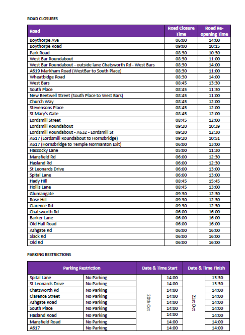 The event will require the closure of roads and road junctions, car parking restrictions as well as the suspension of a number of Traffic Regulation Orders between 04:00 until 16:00 on Sunday 21st October 2018.