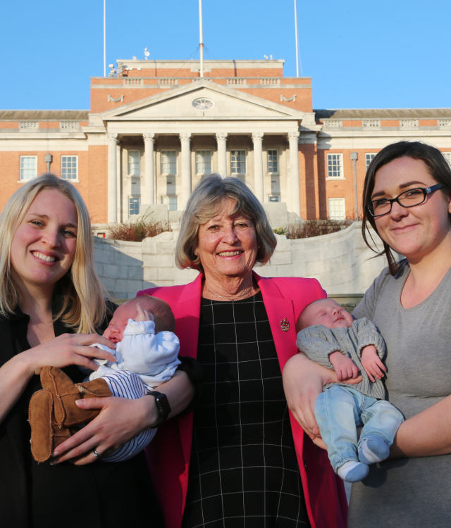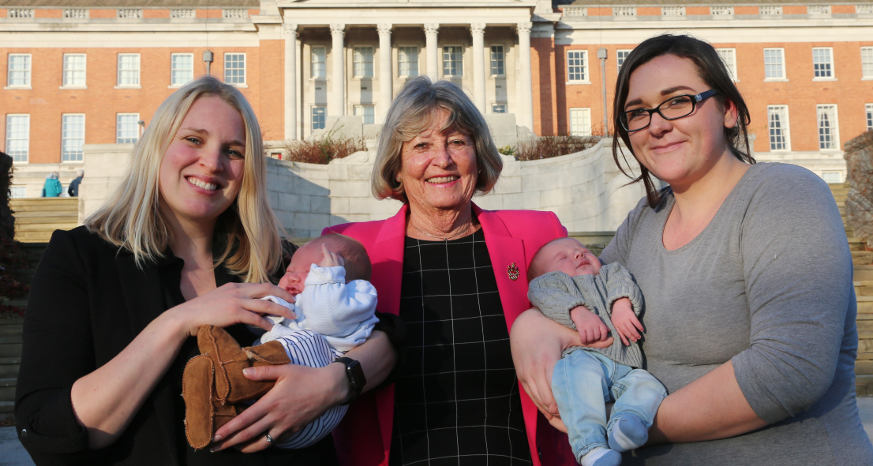Two new mums, their babies and Councillor Carol Hart outside Chesterfield Town Hall.