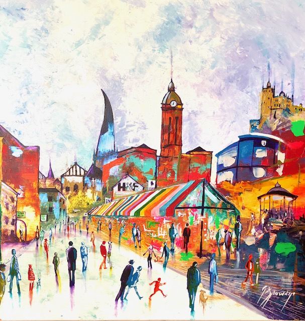 Pete Spowage, a Nottingham based artist, who visits the town’s fleas market every Thursday, has created vibrant canvas pieces using oil, which capture the heart of the town, including Market Square and the Crooked Spire.