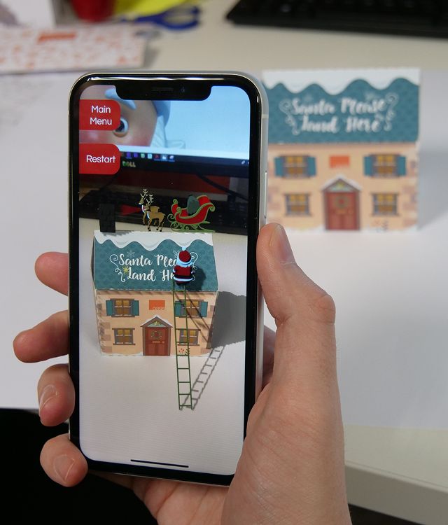 The Mini Santa Christmas card was completely made in-house by Oasis, from the printing of the 3D pop-up card, to the laser cutting, to the augmented reality, to the animation.