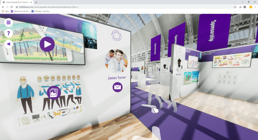 The online system allows students to display videos, images, and documents within their own custom CGI exhibition stands, all of which can be viewed by potential employers at the click of a button.