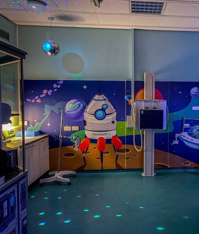 “We’ve become a reference site for Fujifilm after they redeveloped our Radiology Department and they offered to come in and design the space for us. It was their idea to fill the walls with spaceships, aliens, planets, stars, installing some mood lighting and even put what can only be described as a mission control panel across our own scanning booth. It’s really very inventive, visual and I think some of the parents and even my colleagues get a bit of a buzz from it as well.”