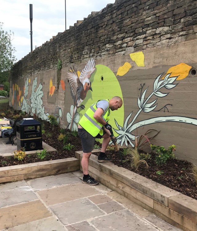 The new space at Edinburgh Road Park features a number of raised beds that have been planted with wildflowers and plants to support pollinators like bees, new paving, 15,000 spring flowering bulbs and local urban artist Peter Barber has created a wall mural that celebrates nature behind the raised beds.