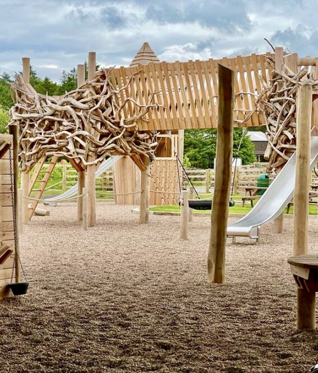 Built of beautiful, rustic oak and larch, featuring enchanting twisted stagwood around much of the equipment, the hamlet is designed to encourage imaginative, sensory, physical and problem solving play for tots through to tweens, also providing delight for parents as they get involved too.
