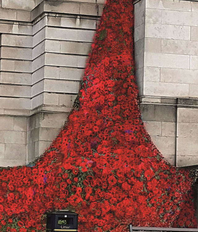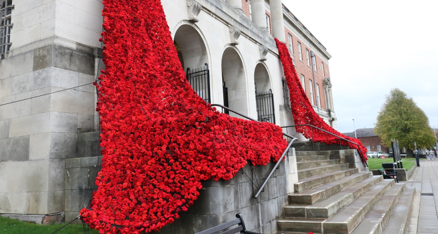The poppy cascade was installed on the front of the Town Hall on Tuesday 31 October by members of The Royal Engineers Association, who are the custodians of the poppies. Each year the Royal Engineers Association ensure the poppy fall’s safekeeping, making sure it is dry and safely stored and any repairs are carried out prior to their next outing.