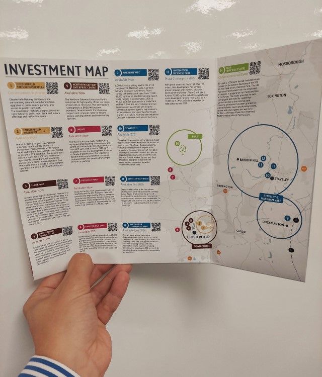 Destination Chesterfield, which is responsible for promoting Chesterfield as a place to invest, published a map today highlighting new real estate and regeneration opportunities in the town. The map includes opportunities for new homes, light industrial, hospitality and leisure units around Chesterfield rail station, and retail, office and residential developments in Chesterfield’s historic town centre.