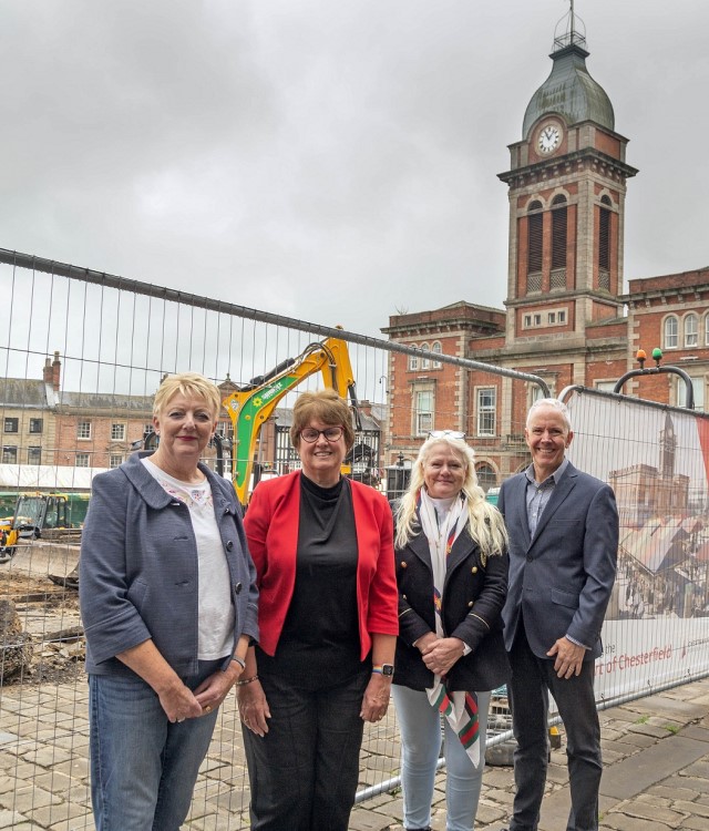 Councillors Tricia Gilby and Kate Sarvent met with Louise Bruynseels a regular market trader and John Allen the Construction Director at contractor Thomas Bow, to see how works had been progressing to the upper section of Market Place during the first week of construction.
