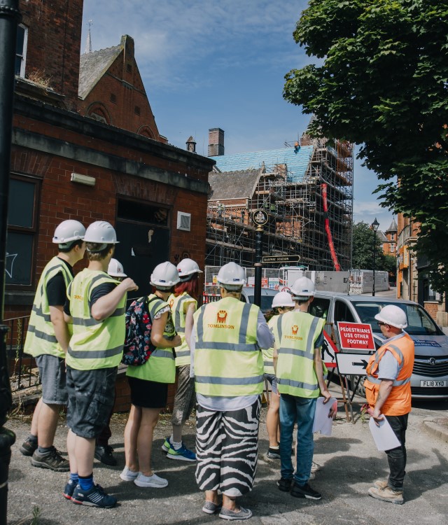 On Thursday 18 June, the students were given a tour of the construction site. After a health and safety talk from Jack Harvey, Technical Apprentice and putting on the appropriate PPE, Jason Tromans, Site Manager for G F Tomlinson, led a fantastic tour of the building. This included how key parts of the building are being restored and the interesting things that have been found on-site such as old newspapers and messages on the walls. Students were able to see a variety of construction trades at work, including roofers, joiners, ground workers, and scaffolders.