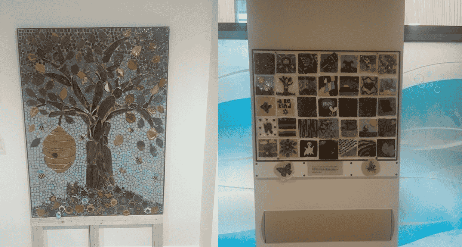 Located at ‘The Hive’ – a communal space, located at the Derwent Unit in Chesterfield, the hand-crafted art display of a mosaic tree and tiled wall was co-created by patients on the unit, the Recreational Activity Team, and designed by Rosanna Scrase, Artist and Recreation Worker. The artwork was created at the Hartington Unit, also at the Chesterfield site, before patients relocated to the Derwent Unit in March 2025.