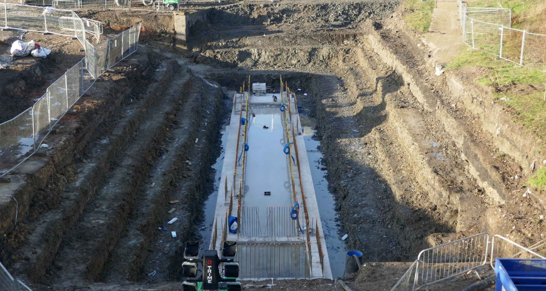By mid-December, the base slab for the Keith Ayling Lock had been completed, clearly showing how the restored basin will be raised to its final level. Historic stonework from Bellhouse Basin was carefully removed, labelled and stored, ready to be reinstated as part of the restoration.