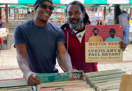 Stallholders at Chesterfield Record Fair holding up a vinyl record