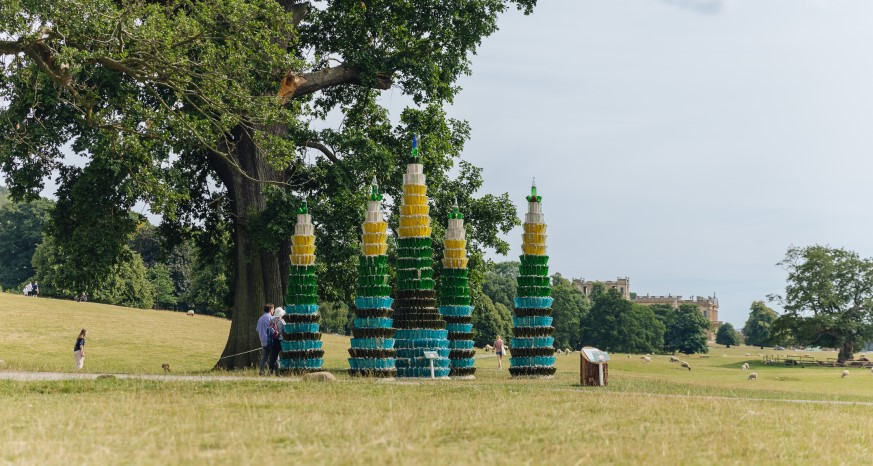 Elysian Towers by Shrine (also known as Brent Allen Spears) with Derbyshire Virtual School: Shrine has worked with young adults from Derbyshire Virtual School to create Elysian Towers. The artwork is made from ‘rubbish’ and found objects sourced locally by the participants themselves, using recycled glass donated by Ardagh Glass and plastic bottles stacked into towers, celebrating the joy of the unknown and making a monument dedicated to making the not-precious precious.
