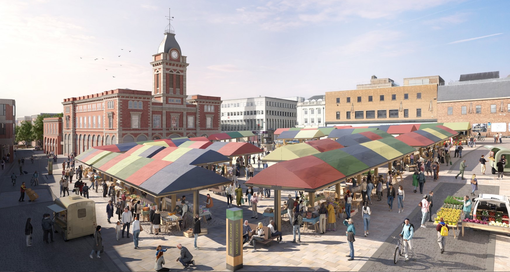 New layout for Chesterfield Market with contemporary stalls, heritage colours, Market Hall in the background, town pump a feature