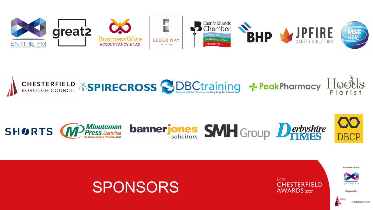 The 2022 Love Chesterfield Awards are supported and made possible by several sponsors and partners, including: Banner Jones Solicitors, BHP Accountants, Chesterfield Borough Council, DBC Training, Derbyshire Times, East Midlands Chamber (Derbyshire, Nottinghamshire, Leicestershire), EntireFM – Complete Facilities Management, Elder Way, Hoods Florist, JP Fire Safety Solutions, Minuteman Press Chesterfield, MSE Hiller, Shorts Chartered Accountants, Spirecross Ltd, and Sutton McGrath Hartley.