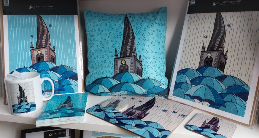 Matt Cockayne’s new store is now open, based at The Green in Hasland. The new studio provides a workspace for Matt, alongside an art and gift shop stocking prints, mugs, framed art, cards, cushions and more.
